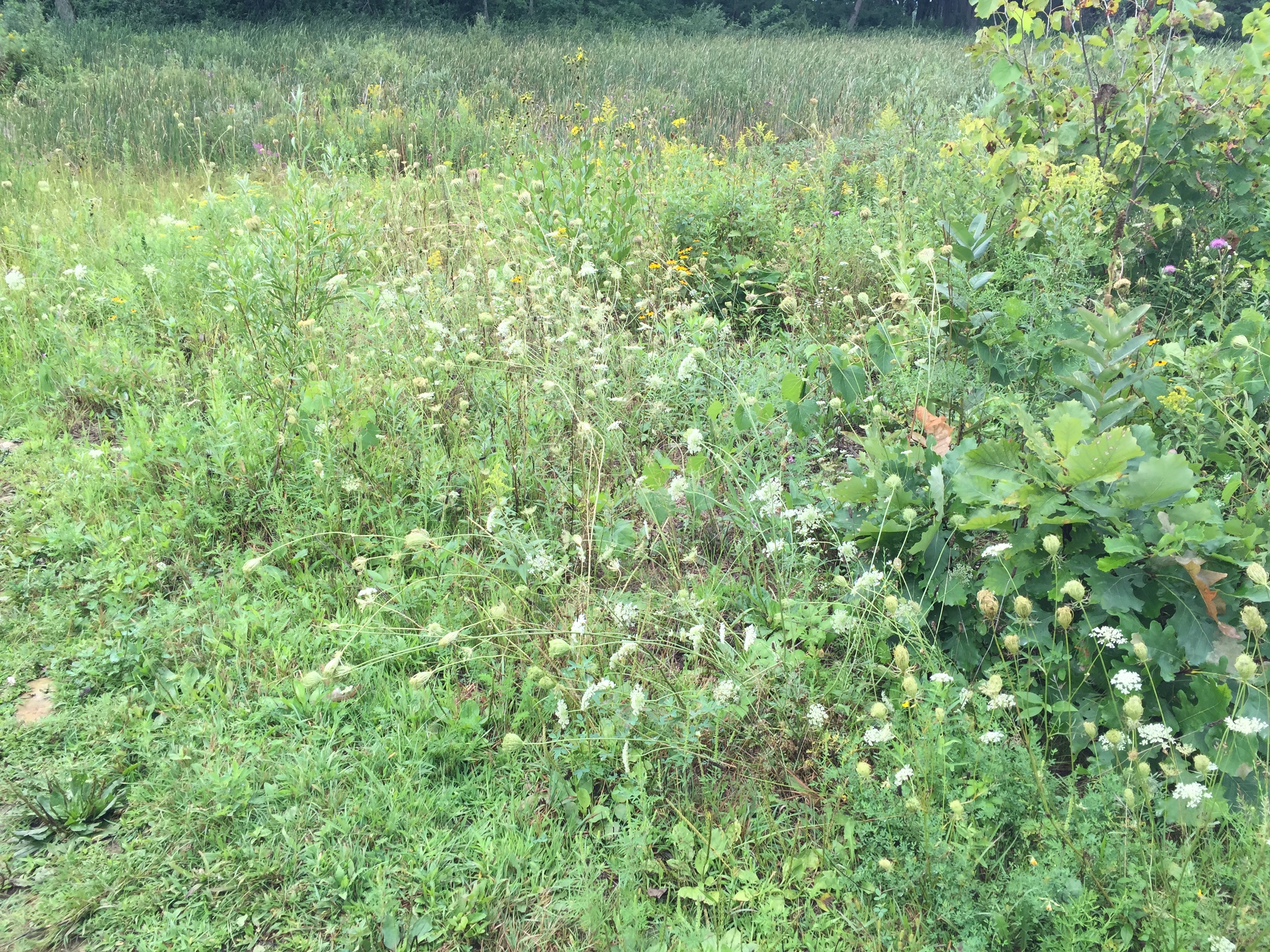 IMG_2408We explored the east shoreline of Ottawa Lake and took the freshly cleared trail around the north side of the fen, celebrating the progress that has been made.  Jared pointed out a few weeds like Japanese hedgeparsley and teasel that were just starting to make inroads and, needless to say, I pulled all I could find.   There is still a lot more weed pulling and weed seed collecting to do at both the Ottawa Lake Fen SNA and at the Scuppernong Springs Nature Trail.  I started on the queen anne’s lace near the Hotel Springs and Jared tells me I’m way ahead of the DNR on this one.